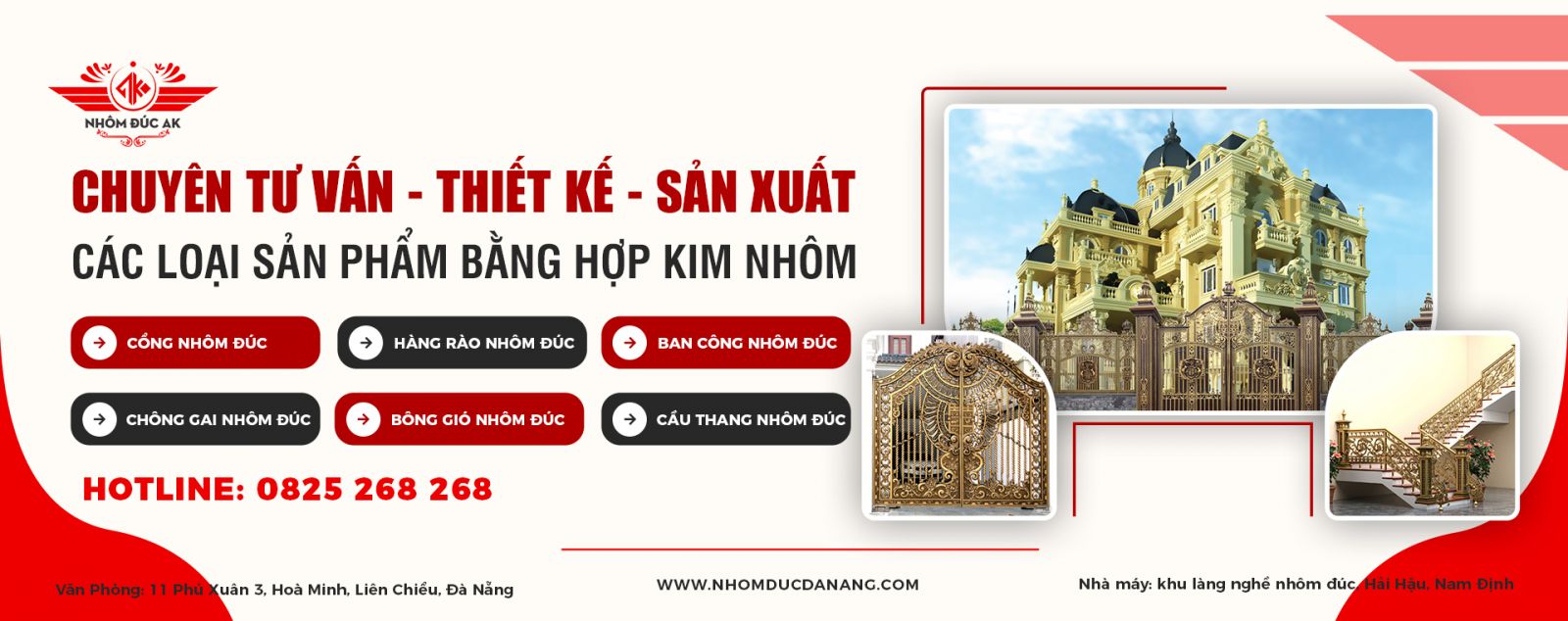 Quý khách hàng vui lòng liên hệ Nhôm Đúc AK để được tư vấn chi tiết về các sản phẩm nhôm đúc cao cấp như cổng, lan can, ban công, hàng rào... Chúng tôi cam kết mang đến giải pháp thẩm mỹ - bền đẹp - sang trọng với giá thành hợp lý nhất. Đội ngũ tư vấn của AK luôn sẵn sàng hỗ trợ nhanh chóng, tận tâm và chuyên nghiệp, giúp bạn chọn lựa được mẫu thiết kế phù hợp nhất cho công trình của mình.