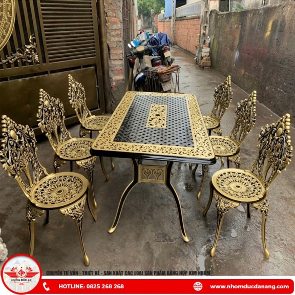 - Chất liệu cao cấp: Bàn ghế được sản xuất từ hợp kim nhôm, thường là các loại nhôm có hàm lượng silic cao, giúp tăng độ bền và chống chịu thời tiết.
